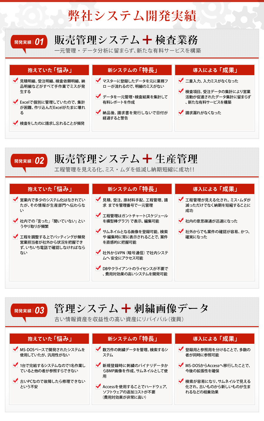 ①で洗い出された現状の問題点を前提として、システム開発の目的を実現する手段が改善のご提案となるのです。
